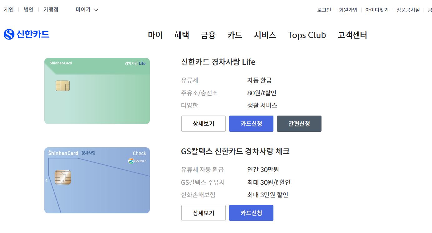 - 신한카드 : 신한카드 경차사랑 라이프, GS칼텍스 신한카드 경차사랑 체크