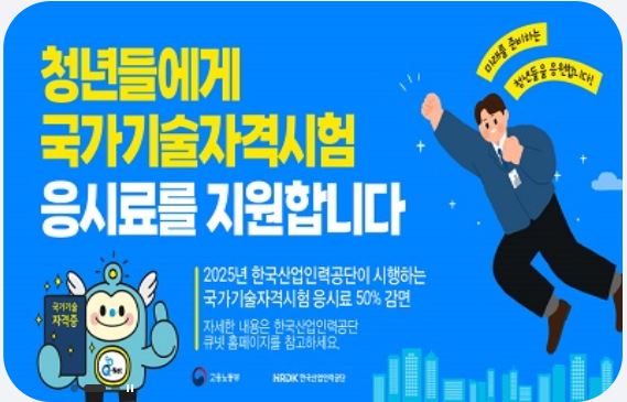 청년층의 경제적 부담을 완화하고 자격 취득을 장려하기 위해 정부에서는 국가기술자격시험 응시료의 50%를 지원하는 제도를 운영하고 있습니다.