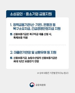 - 산불 피해를 입은 개인 및 사업자의 기존 자금 융자에 대해 일정 기간 이자 상환을 유예