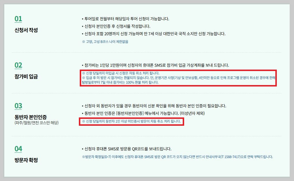 단, 입금 후 미방문 시 참가비는 환불되지 않습니다. 다만, 기상 상황, 안보 문제, 최소 인원(4인 미만) 미충족 등 운영기관 사정으로 인해 프로그램이 취소된 경우, 탐방일로부터 7일 이내에 100% 환불 처리됩니다. 참가비는 원활한 운영과 안전한 프로그램 제공을 위해 사용되므로, 정확한 입금 절차를 따라야 합니다.