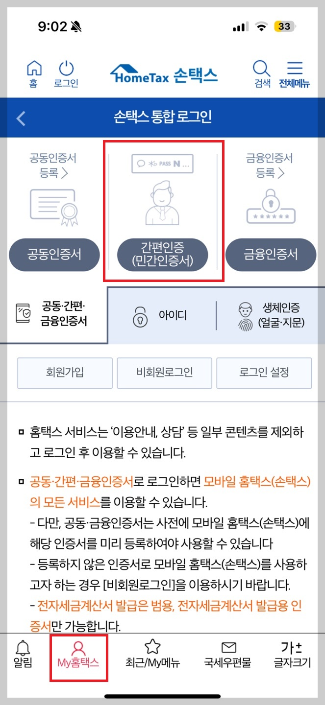 공동인증서, 간편인증(네이버, 카카오 등)으로 로그인