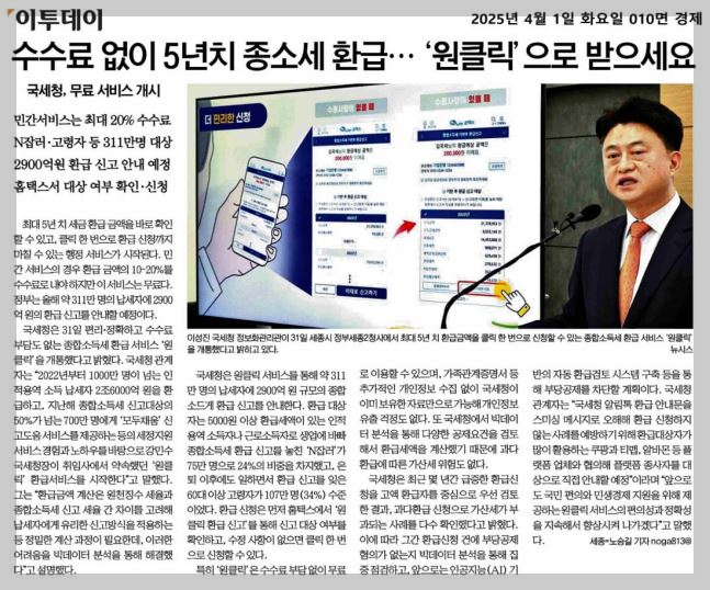 ‘종소세 원클릭 환급’은 2025년 국세청이 새롭게 도입한 맞춤형 환급 간편 신청 서비스입니다. 기존에는 종합소득세 환급을 받기 위해 복잡한 서류 확인 및 절차가 필요했으나, 이번 제도는 국세청이 미리 수집한 자료를 바탕으로 환급 대상자를 자동으로 선별하고, 해당 납세자가 홈택스 또는 손택스를 통해 단 한 번의 클릭으로 환급 신청이 가능하도록 간소화한 것이 핵심입니다.