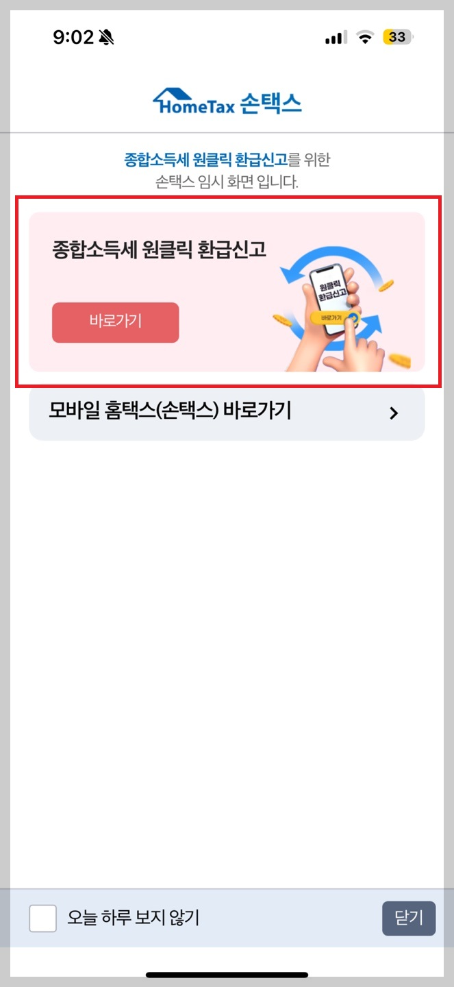 해당 메시지에 기재된 링크를 통해 홈택스 또는 손택스 앱에 접속하면 ‘원클릭 환급 대상 여부’ 확인이 가능합니다.