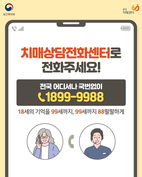 치매상담 콜센터(☎1899-9988)는 모든 국민의 ‘인지건강 지킴이’입니다.