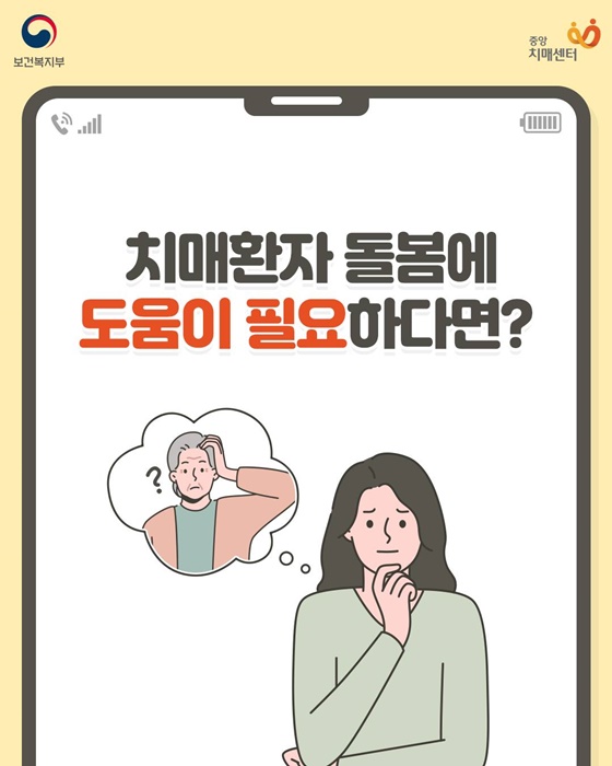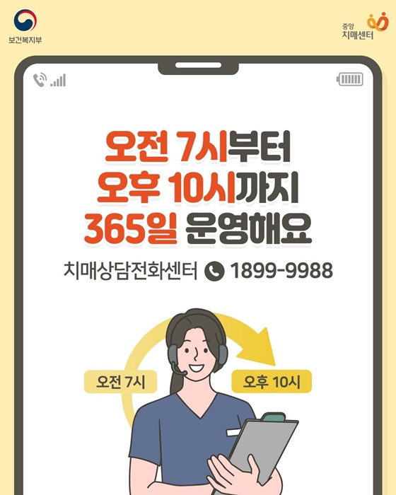 치매환자 돌봄이 어렵다면? 치매상담 콜센터 1899-9988 로 전화하세요. 치매지원센터 전문상담사가 365일 정서·돌봄 상담을 지원합니다.